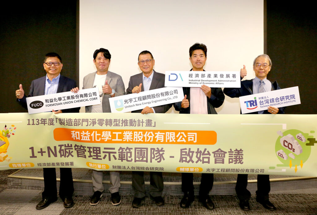 為有效推動台灣製造業的減碳進程,由經濟部產業發展署指導、財團法人台灣綜合研究院執行、光宇工程顧問公司輔導,攜手為和益化學工業股份有限公司等12間公司共同建構淨零轉型平台,今(29)日上午召開「1+N碳管理示範團隊」啟始會議,凝聚產業整體共識,採取「以大帶小」的推動策略,由領頭廠商和益化工與N家供應鏈或產業鏈共同串聯,投入企業減碳的行列。