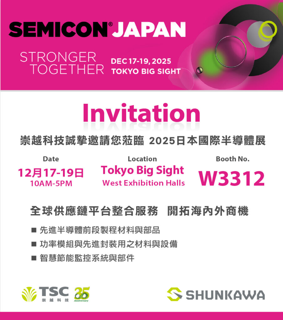 Topco Scientific Co., Ltd. (TAIEX: 5434), a leading provider of integrated semiconductor and optoelectronic materials solutions, together with its Japanese subsidiary SHUNKAWA CO., LTD., will join 9 semiconductor suppliers from Taiwan, the United States, and Japan to participate at SEMICON Japan 2025. From December 17 to 19 at Tokyo Big Sight, the group will showcase integrated solutions spanning front-end semiconductor processes, power module applications, advanced packaging materials and equipment, and intelligent energy-saving monitoring systems—demonstrating the strength of Topco’s international supply chain platform.