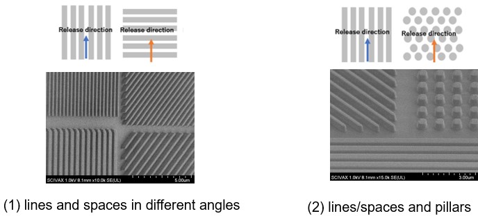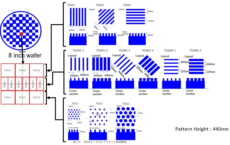 This 8’’ testing mold was designed for evaluating the NIL process of waveguides for AR glasses at the wafer level, This mold is especially useful with the process of high-index resin materials and optimization of nanoimprinting process for mass productions. Pattern design consisted of the binary grating with different fill factors and angles combined with the pillar pattern and blanket region. Full pattern without blanket region is also available.