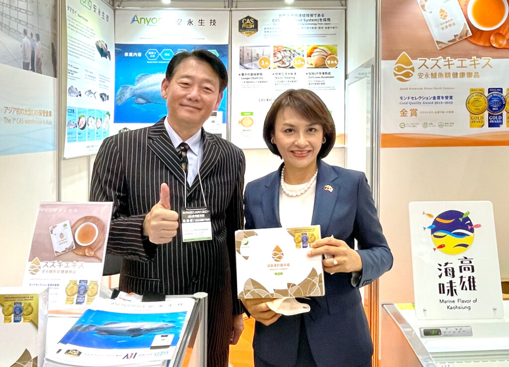 现场展出的还有安永生技的明星商品,安永鲈鱼精-健康御品,不仅是屡获国内外各项评比肯定的世界金奖级产品,更是一款落实「全鱼利用」的商品,以黄金比例将鱼肉、鱼骨、鱼鳞萃取成机能性食品,鱼肉做成鱼排、鱼骨的部分萃取鲈鱼精、鱼鳞则萃取胶原蛋白做成面膜。同时,安永鲈鱼精-健康御品除了取得臺湾政府健字号认证,也即将成为臺湾首支取得「碳标籤」的鱼精产品,让「绿色消费」成为生活的一部分,落实永续经营理念。